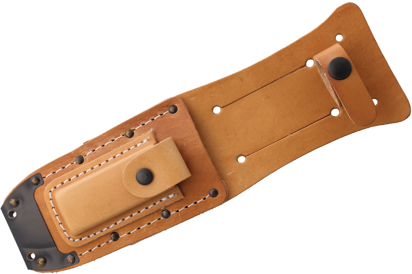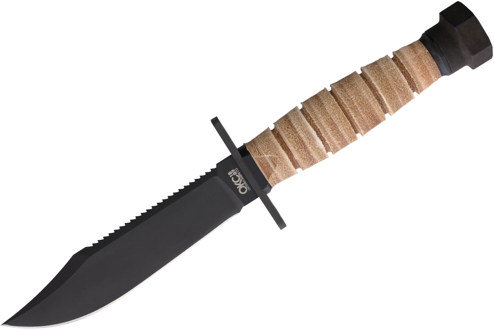 ON1499: 9.75" (24.77cm) overall. 5" (12.7cm) black matte finish carbon steel bowie blade. Stacked leather handle. Steel guard and pommel. Brown leather belt sheath. Boxed.