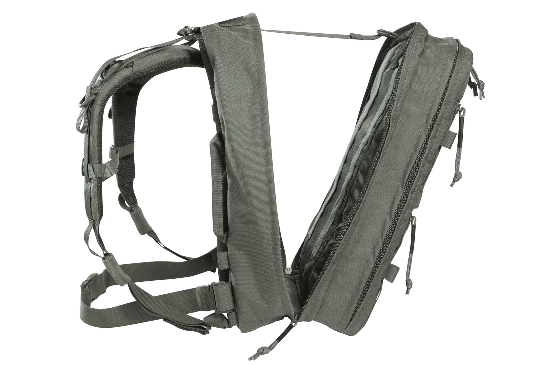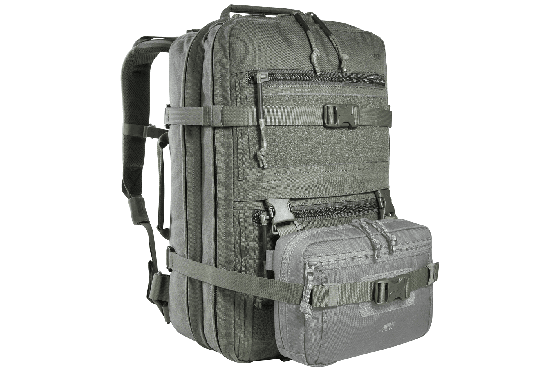 Großer Flucht- und Überlebensrucksack mit vielfältigen Organisationsmöglichkeiten. Der TT Modular Grab Pack 30 IRR bietet 30 Liter Volumen und zwei große, komplett zu öffnende Fächer. Das vordere Fach ist mit 4 eingekletteten Reißverschlusstaschen verschiedener Größe ausgestattet, im Deckel befinden sich flache Organizer-Taschen. Die Rückwand des hinteren Fachs ist mit einer großen Klettfläche sowie zwei MOLLE-Streifen zur individuellen Bestückung versehen. In den flachen Fronttaschen können z.B. Dokumente verstaut werden. Der Rucksack verfügt über ein gepolstertes, auf die eigene Rückenlänge einstellbares Tragesystem, Schulterträger und Bauchgurt lassen sich abnehmen, zum Beispiel, wenn der Rucksack in Fahrzeugen verstaut wird. Sowohl die CORDURA®-Materialien als auch Gurtb ...