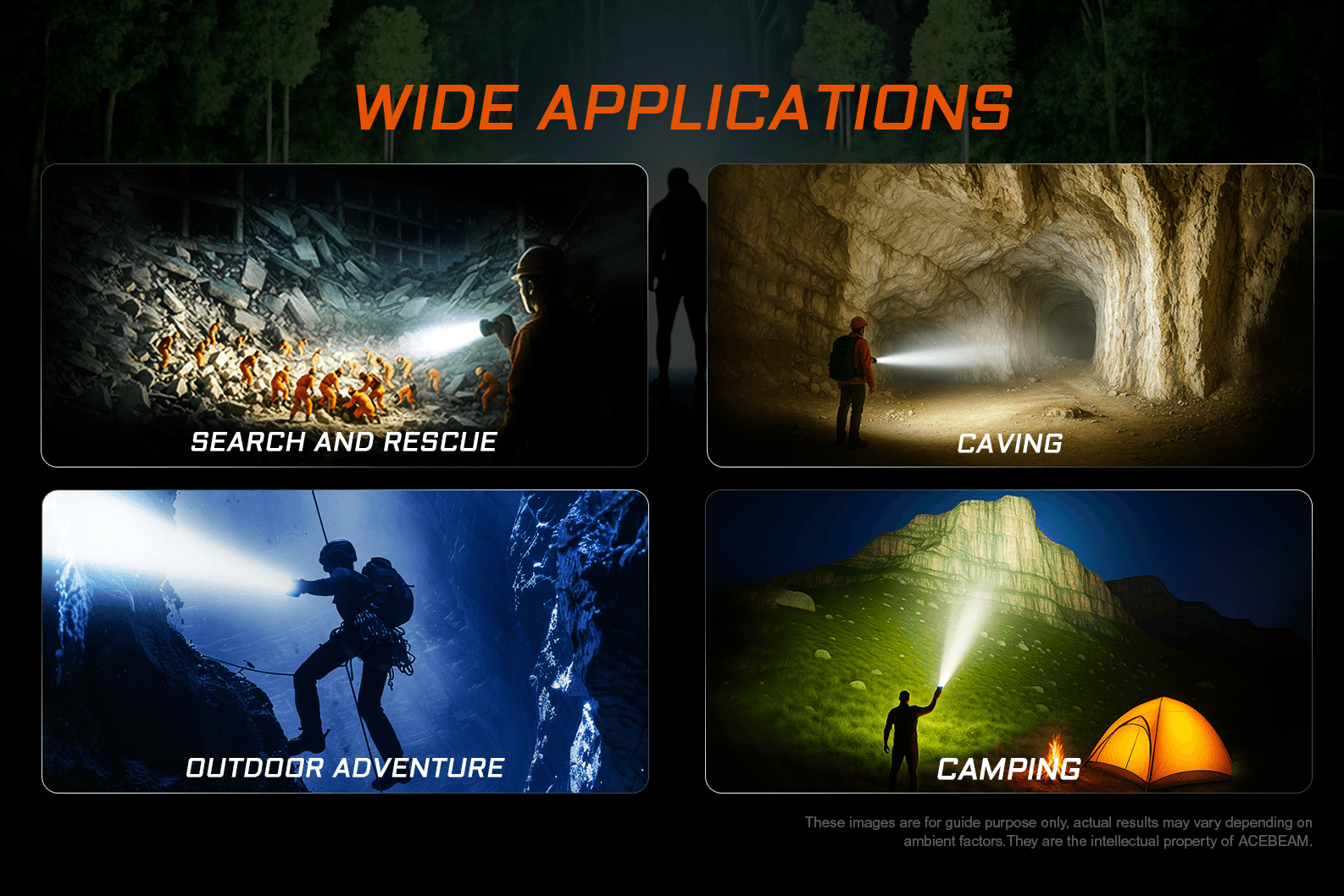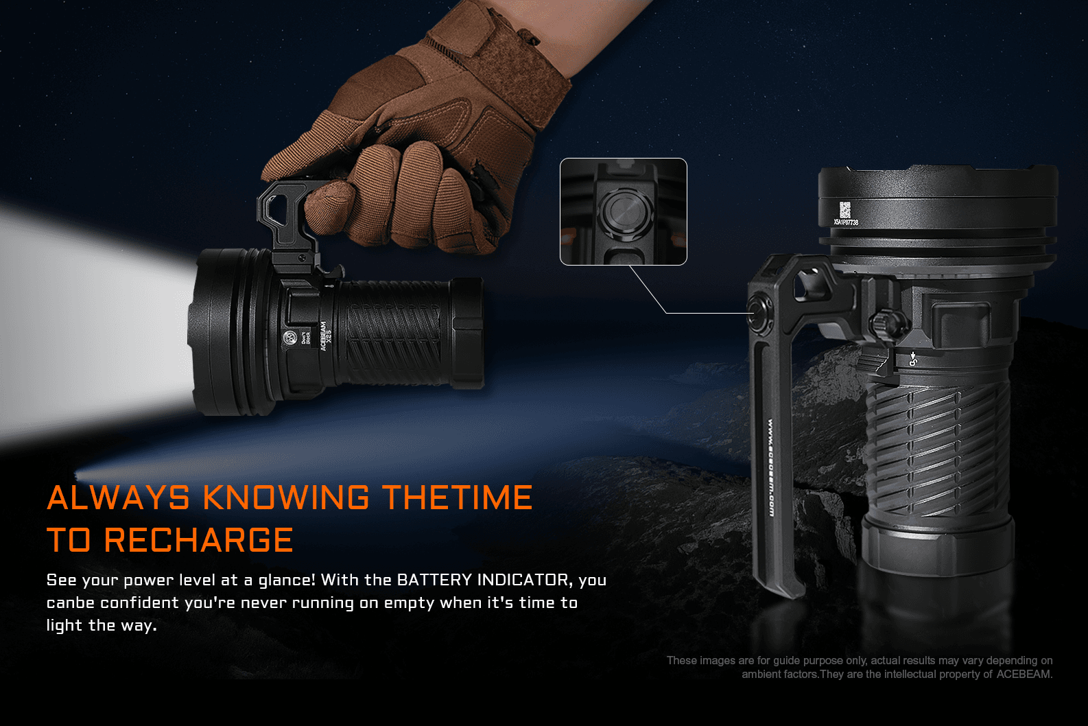 The ACEBEAM X25 is a high-power long range flashlight for exploring, searching, and rescue. Utilizing 16 x CREE XP-LR LEDs with max output 23,000 lumens and beam throw 1553 meters. In addition to white light, it offers RGB lighting beneath the head for atmospheric effects while camping. The 60W fast charging takes just 1.5 hours, allowing quick returns to your adventures. It provides you with two power options, Built-in battery pack version for USB-C charging convenience, or a battery holder version (not featuring USB-C charging) with 4 x 21700 5000mAh replaceable batteries for extended energy needs. Equipped with dual switches (one on the handle and another on the body), and a detachable handle, you have full control at your fingertips, whether using it with the handle or detachi ...