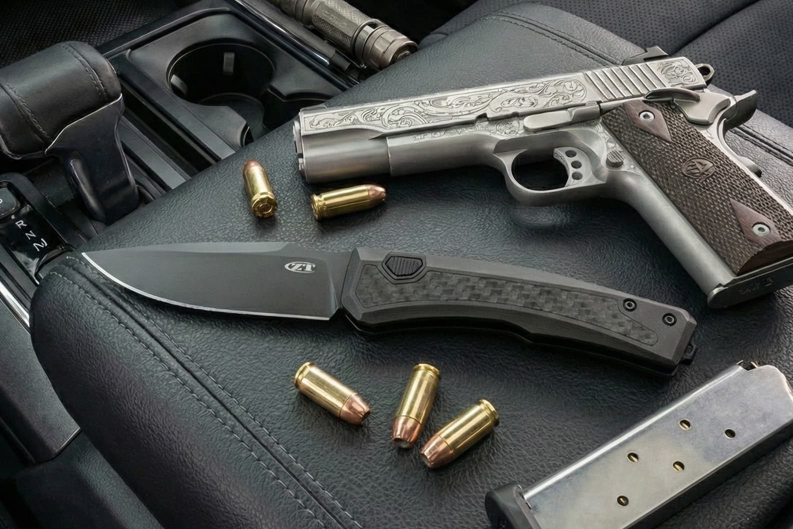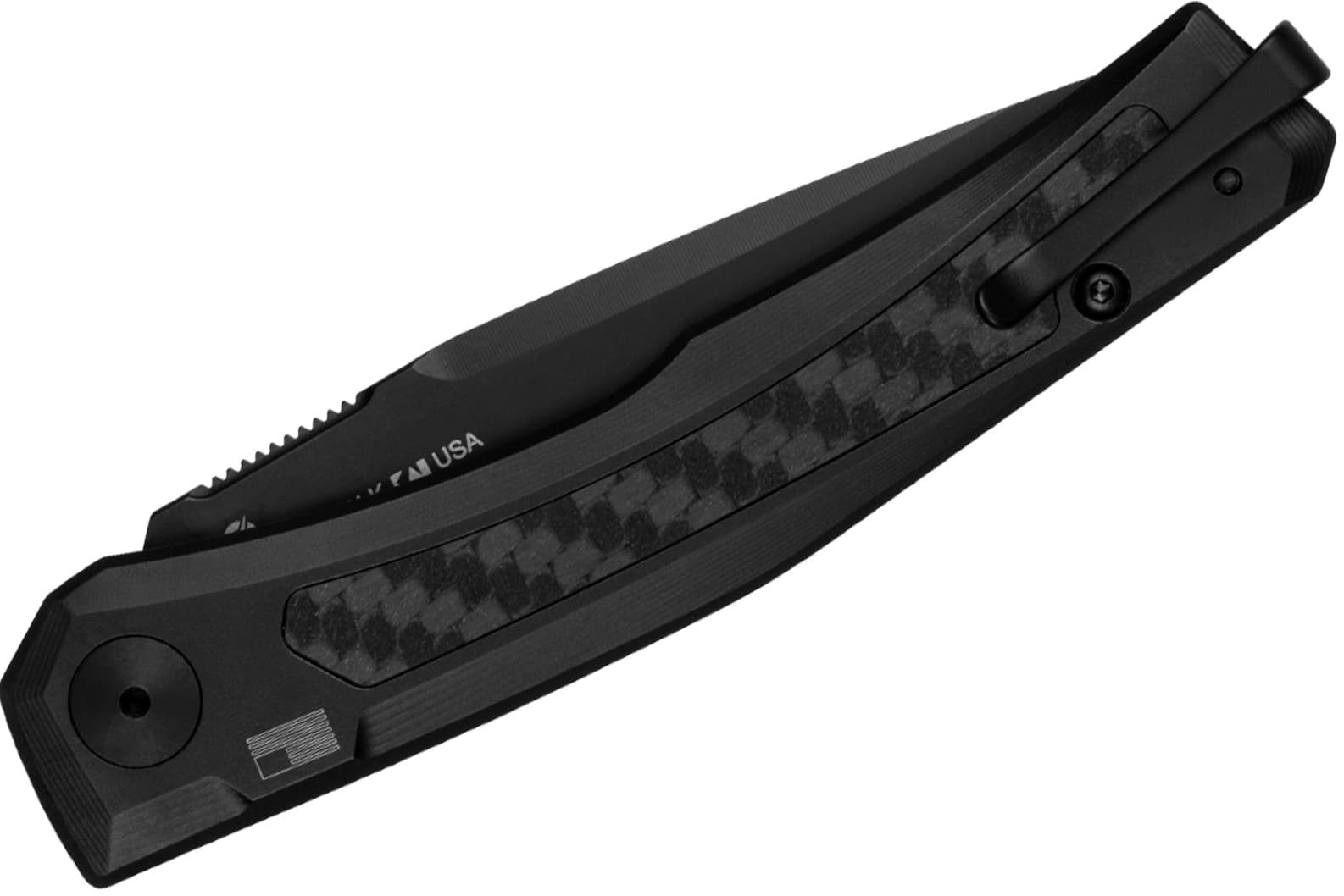 ZT0556BLK - Automatic opening. 4.38" (11.13cm) closed. 3.38" (8.59cm) stonewash and satin finish CPM MagnaCut stainless drop point blade. jet-black PVD coating handle with carbon fiber inlay. Pocket clip. Boxed.