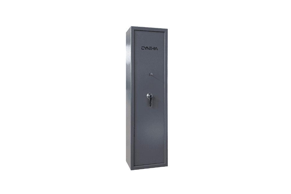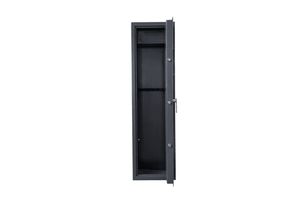 Gun Cabinet SD-E571612,ECBS tested EN14450 S1Size:1450×400×300MM, for 7 guns.Material: low carbon constructional steel,thickness: 3.0mm for door and 3.0mm for body.Lock: key lock,Bolt: 5pcs ø25mm,Handle: L Shape,Color: Grey,Inside: 1pc gun rack(7guns), 1pc key lock ammo box.